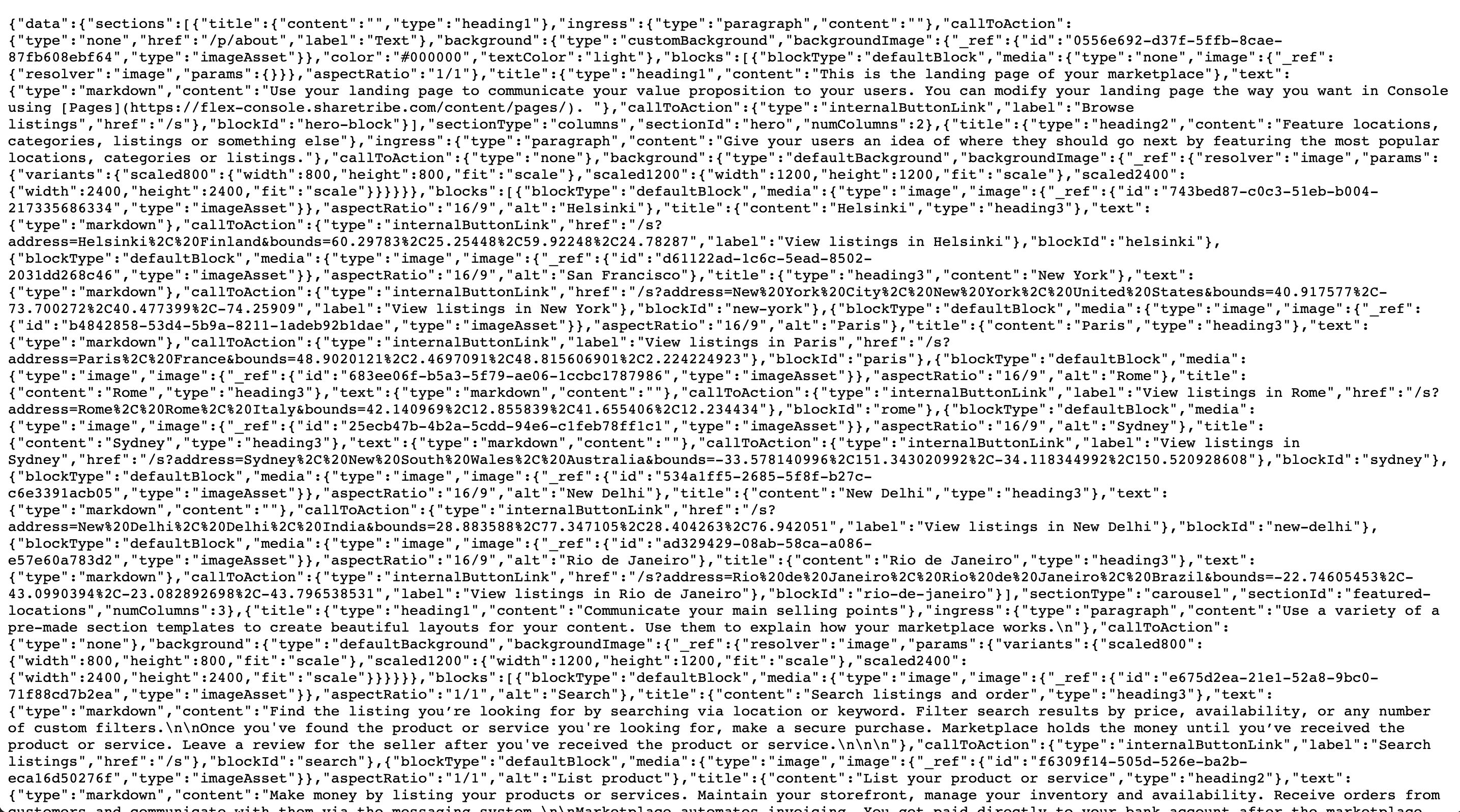 This is the raw JSON API response that encodes the content and structure you have entered into Console. Try pasting the response into your preferred code editor to make it easier to interpret: