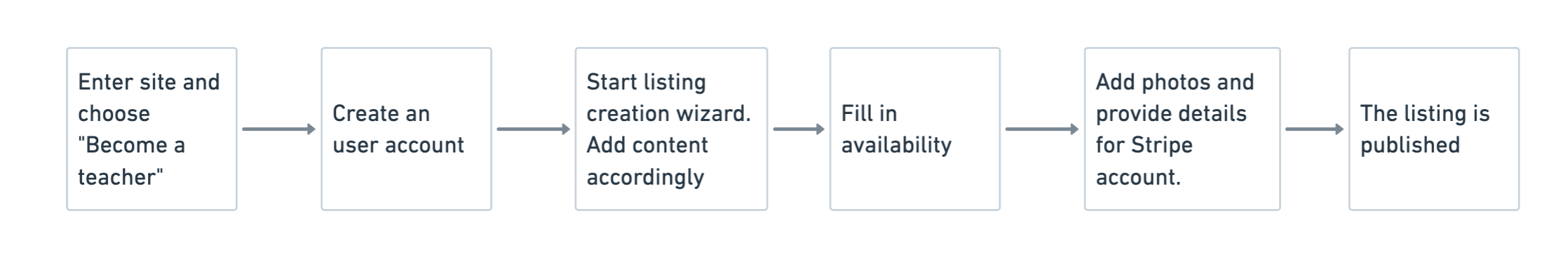 Providers in the Yogatime marketplace create and list their profiles through a listing creation wizard. The wizard is accessed from the top bar's "Become a teacher" call to action.