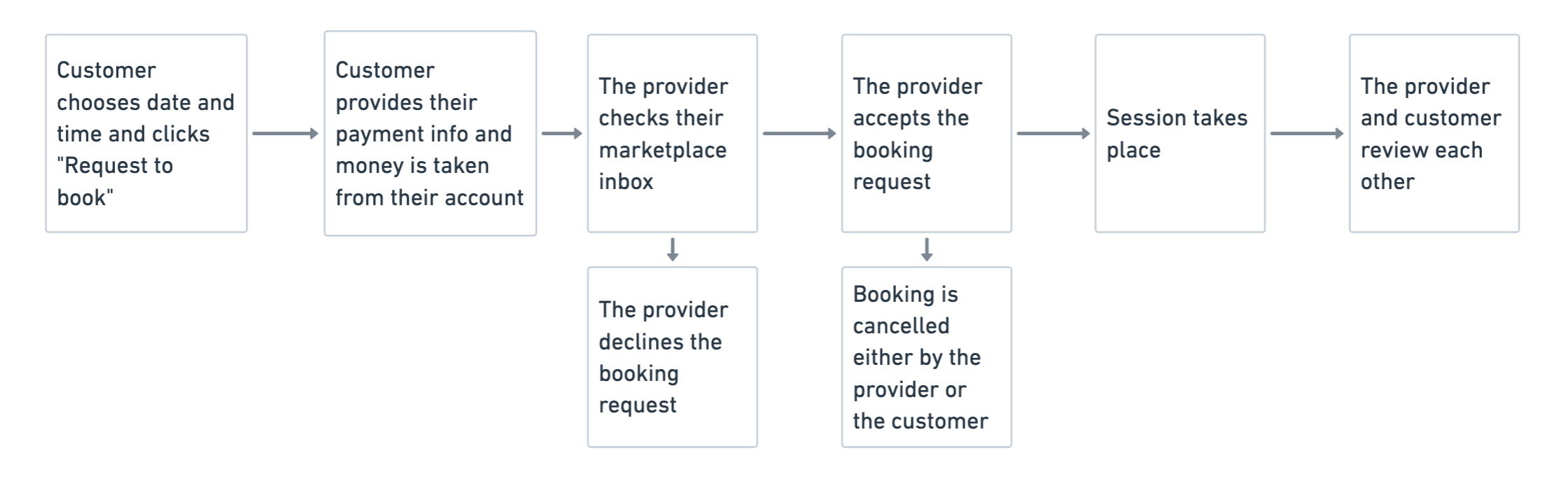 Users view detailed information about the provider on their listing page. Reviews including a comment and 5-star rating are displayed on the listing page too. Users can choose to book a time from the provider’s availability calendars and “Request to book.”