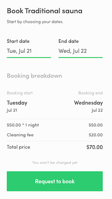 Now, if you open up a listing page and select dates in the booking panel on the right, FTW will fetch line items and you will see a cleaning fee row in the booking breakdown: