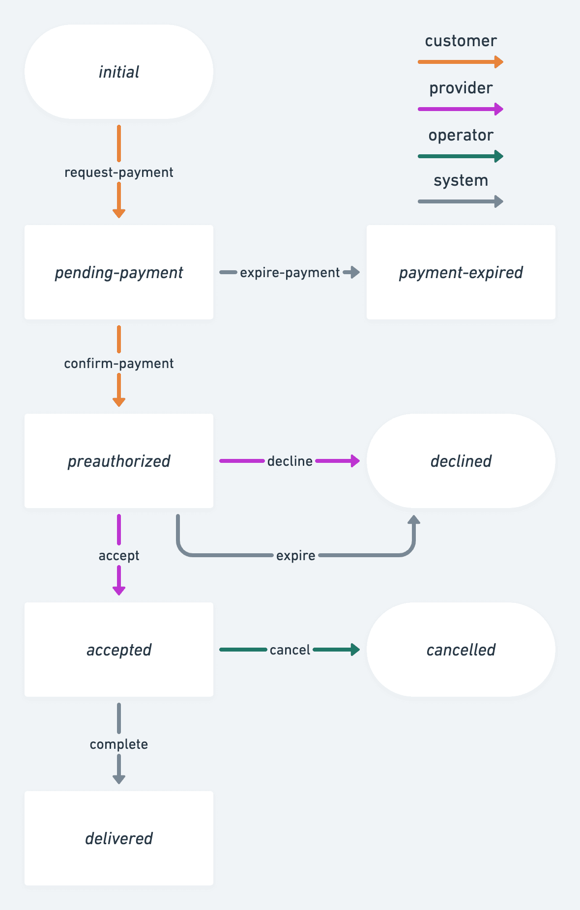 :actorKeywordDefines who has the permission to invoke the transition. Must be one of: :actor.role/customer, :actor.role/provider, :actor.role/operator:actor.role/customer