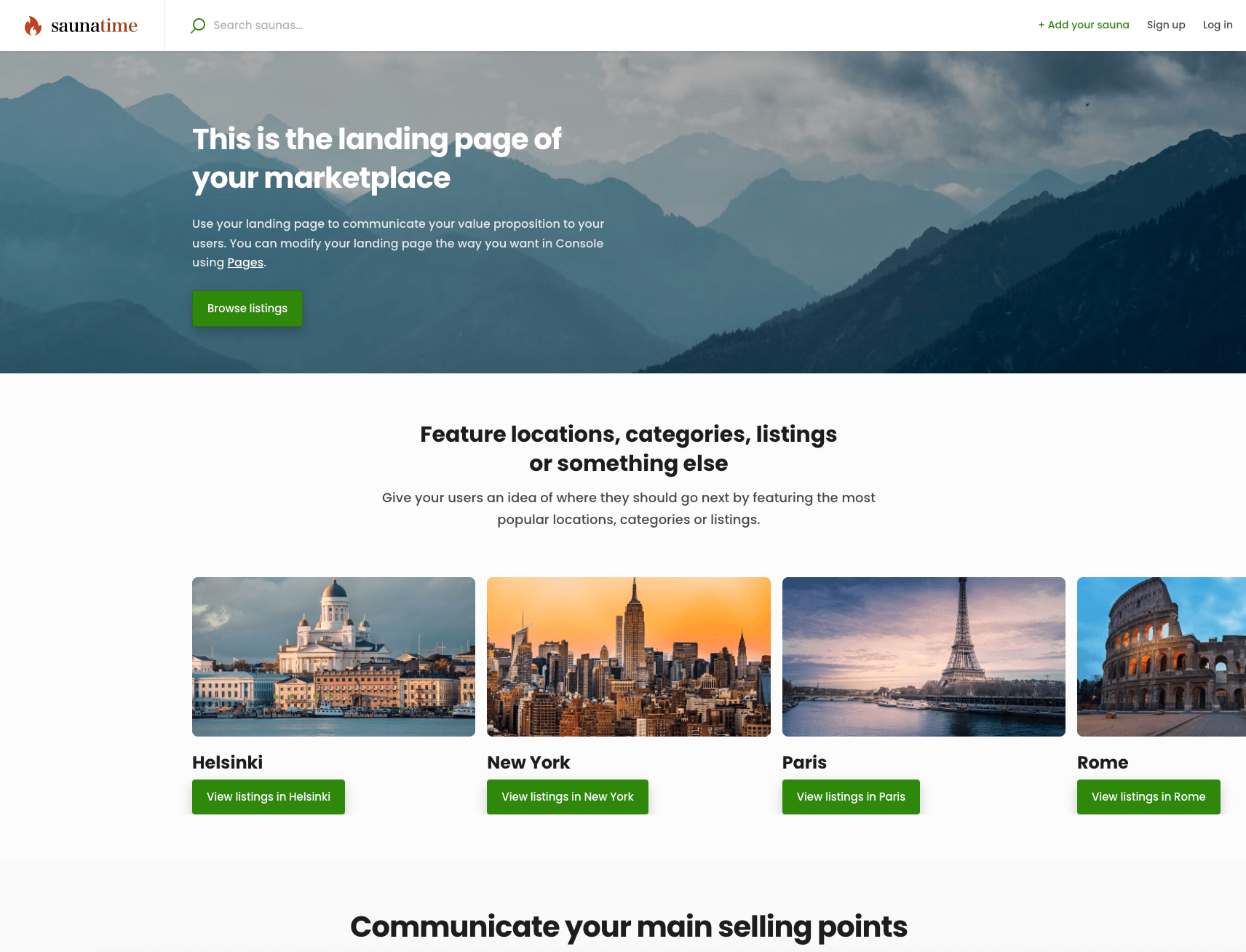 Once you click the link, you can see the default sections for the landing page. You can freely modify, add, and remove the sections as you develop your marketplace.