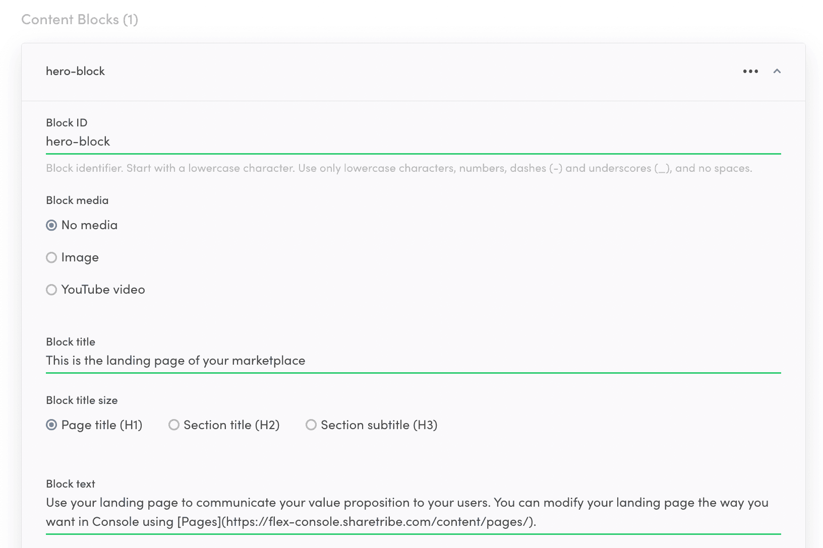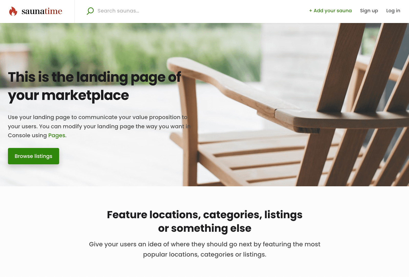 Replace the existing title and text content with your marketplace title and tagline. Click "Save changes", and refresh your landing page.