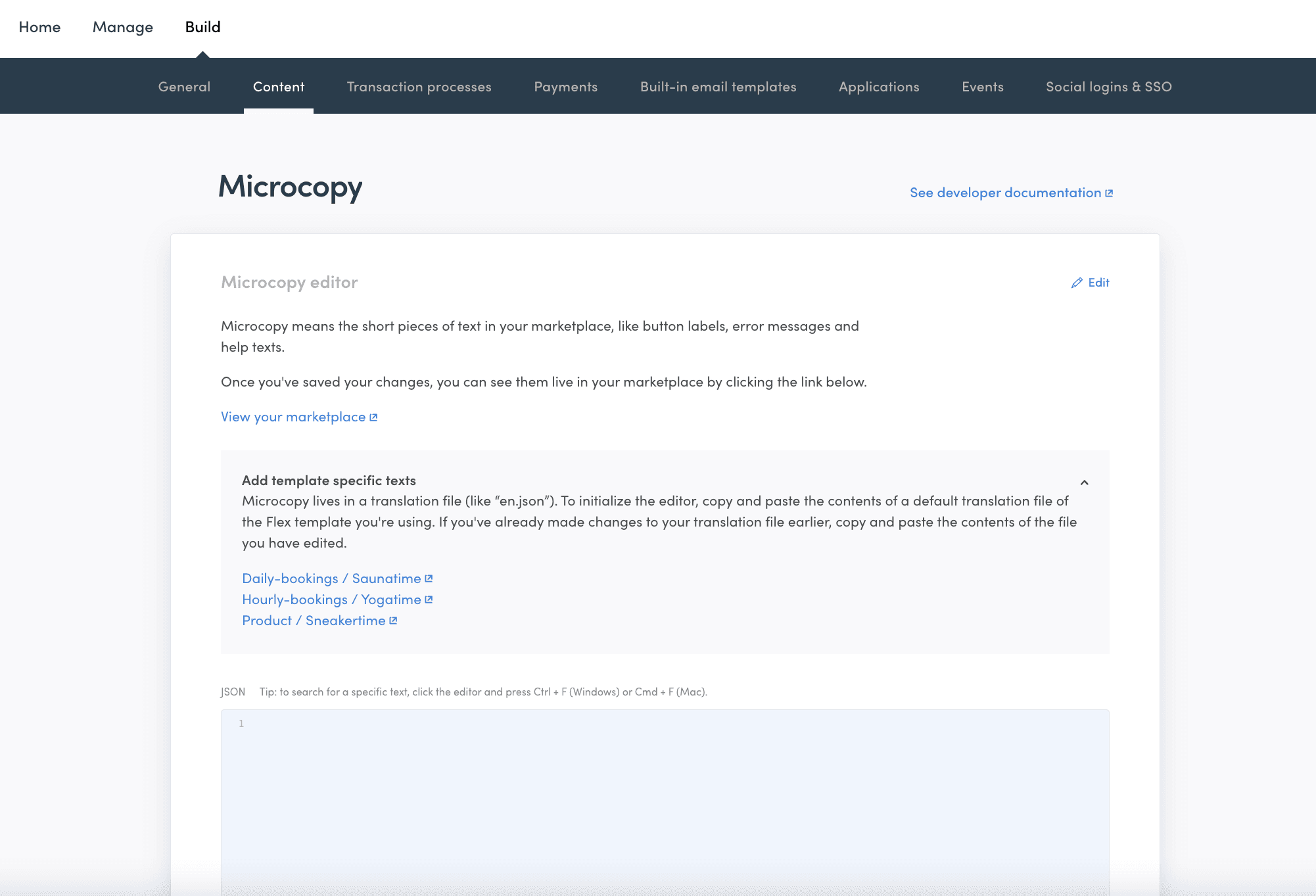 When you first start building your marketplace, the JSON field in the Microcopy section is empty, and all microcopy comes from built-in microcopy files in the template. (We refer to these texts as microcopy, but in the template they are in the translations folder. In addition to the default en.json file, there are other languages available, which is why the folder is titled translations.)